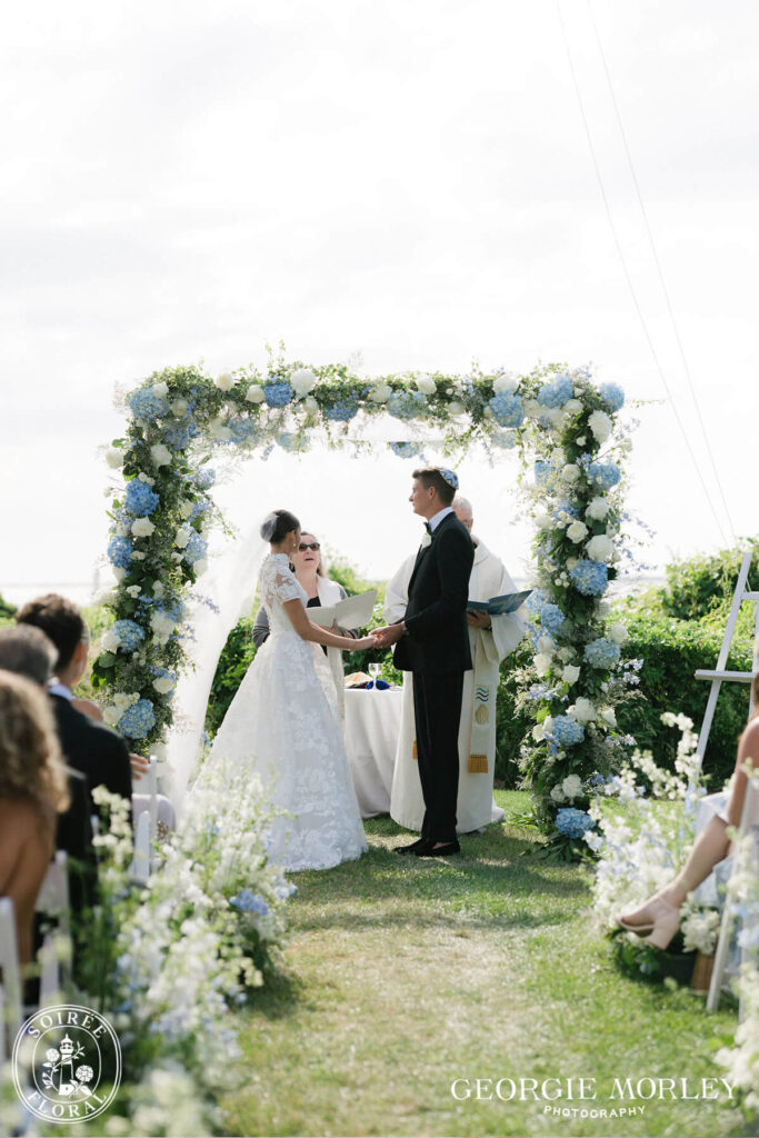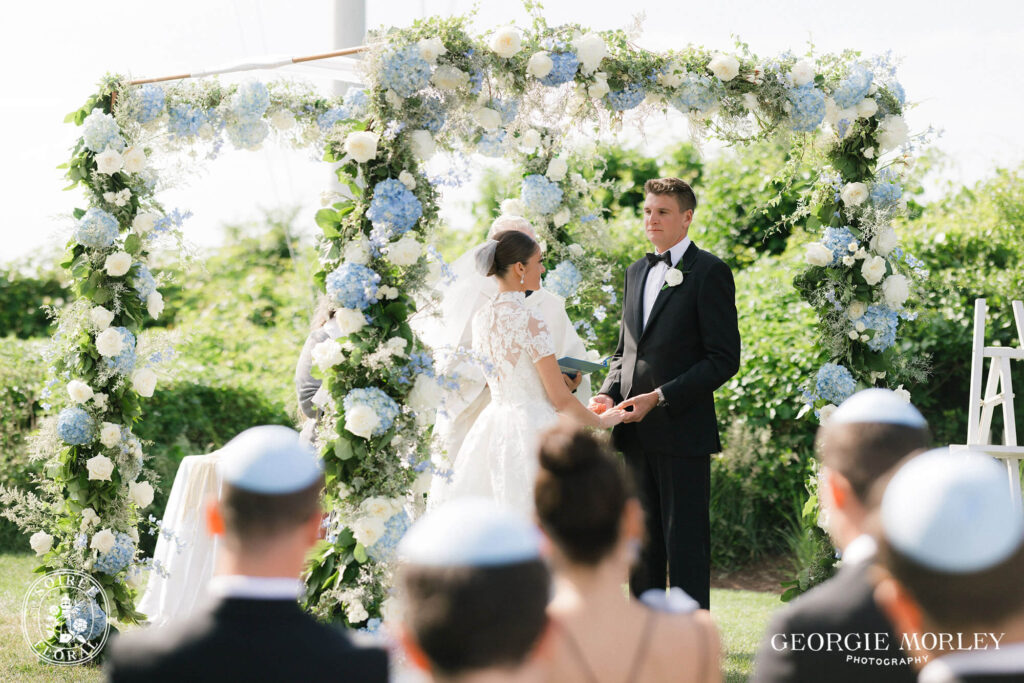 The ceremony took place with panoramic views of the water, framed by a soft, garden-inspired chuppah that just might be one of our favorite designs to date. It was striking and full of summer blooms.