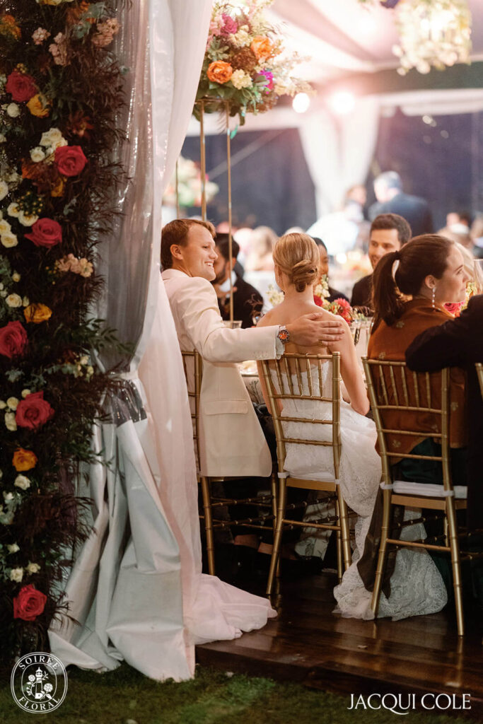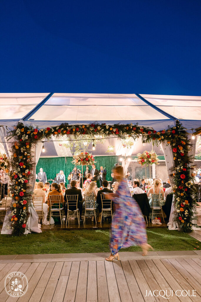 The tented reception was a dream come to life. The entrance alone made a statement—lush, vibrant, and full of personality. And once you stepped inside? Wow. Towering floral arrangements soared above the tables, adding bold elegance and texture that pulled the entire look together. Getting them up was a labor of love, but absolutely worth every second.