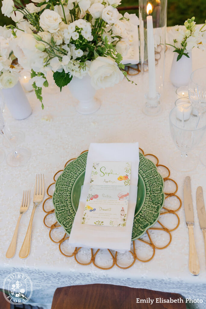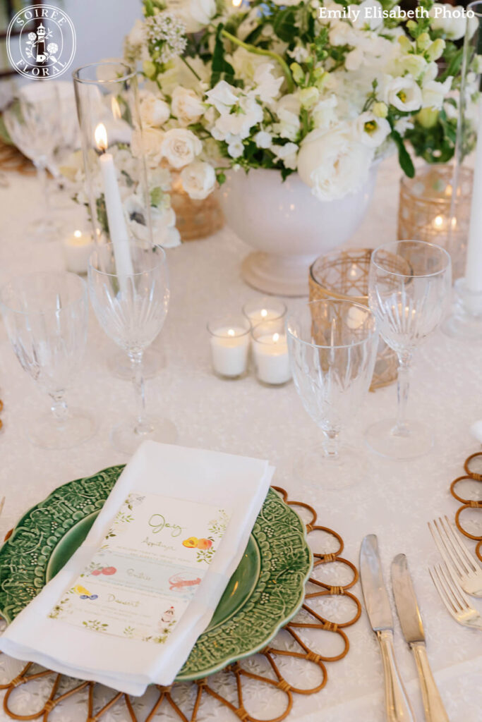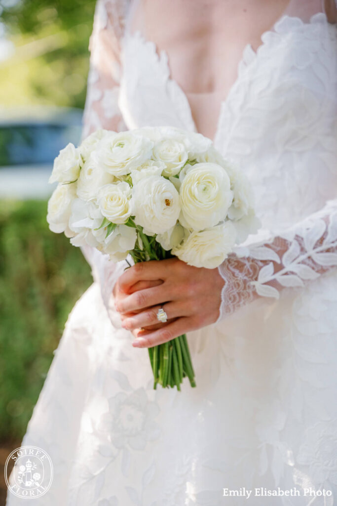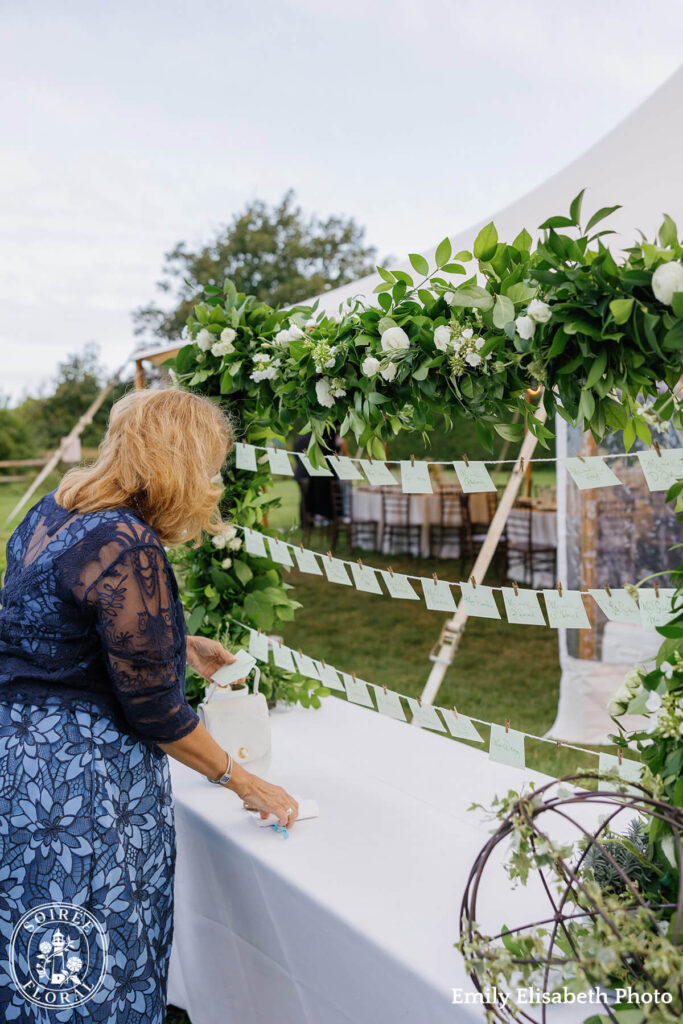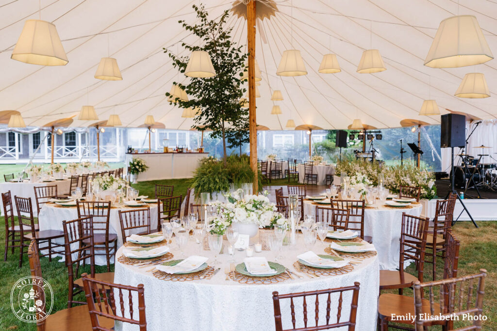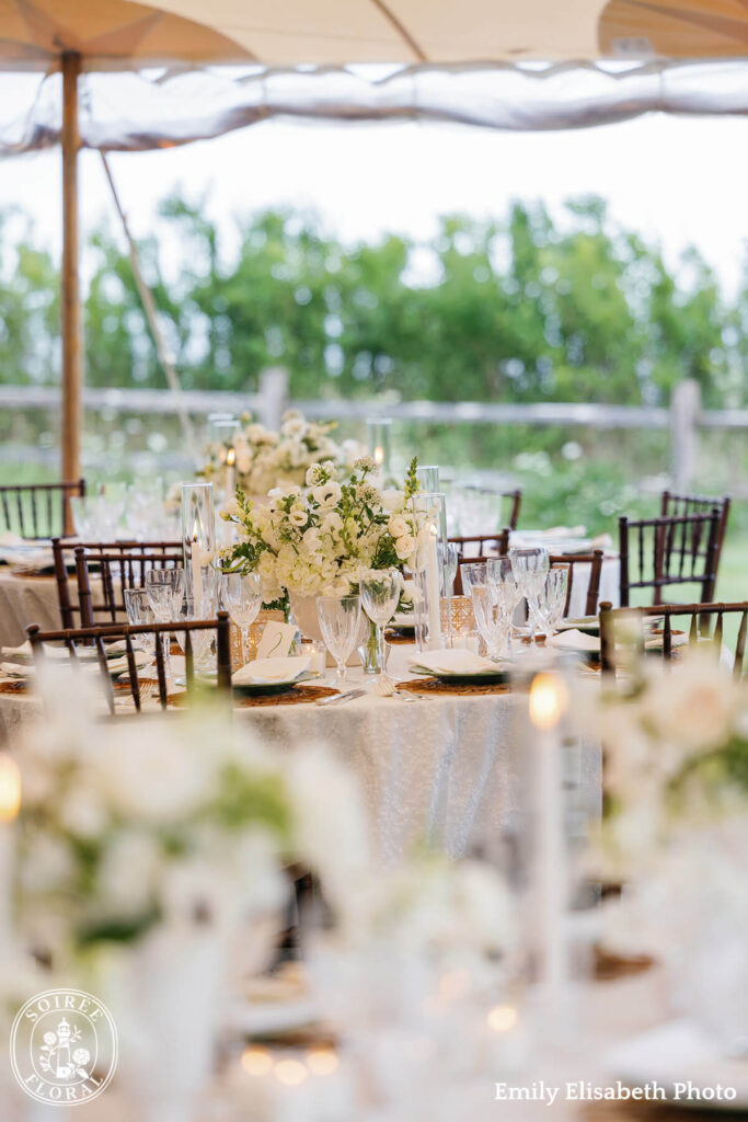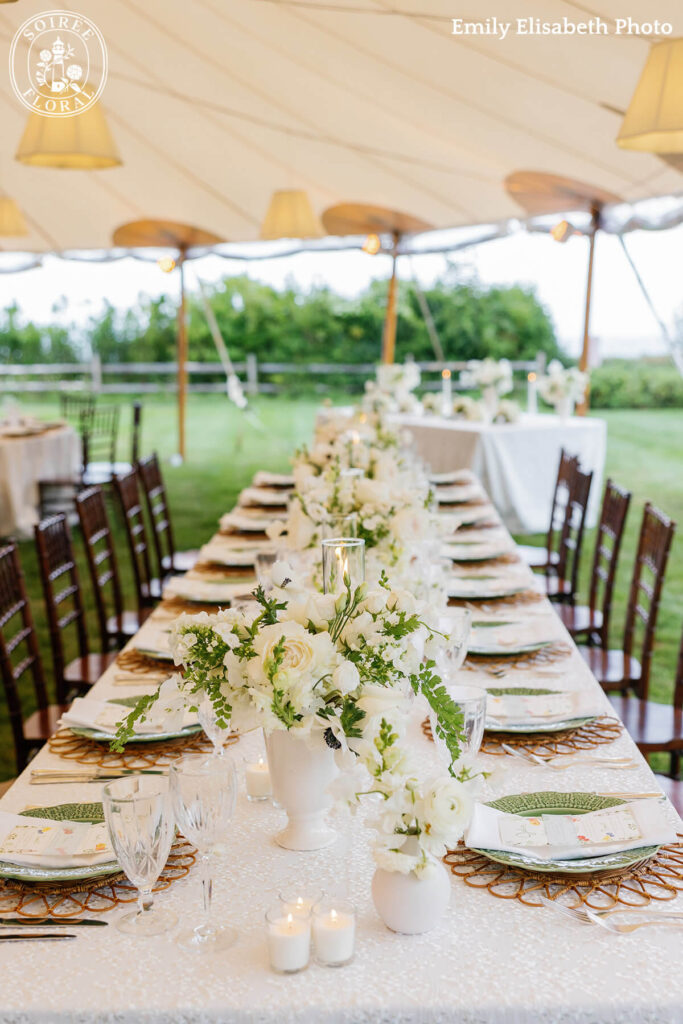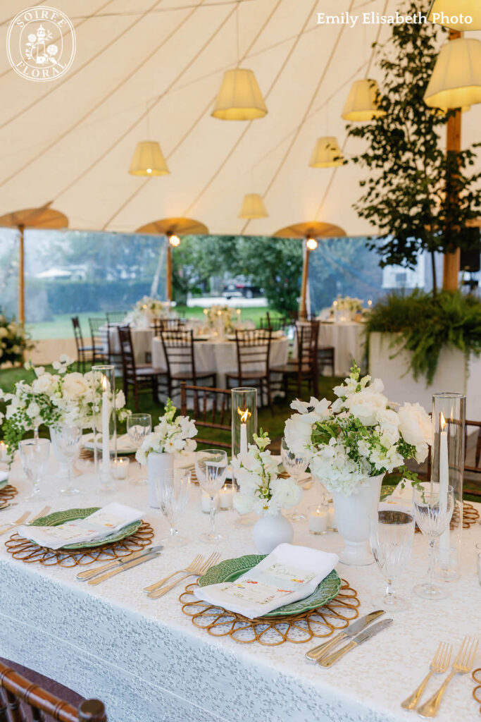 The floral vision was soft and timeless: all-white blooms paired with delicate greenery created a sense of serenity and sophistication that flowed beautifully from ceremony to reception. We especially loved how the white florals stood out against the lush greenery and rich textures of the tent—elevated, fresh, and quietly luxurious.
